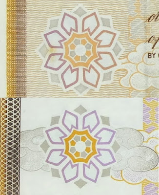 先看五十元。整體來說,中張獅子身上不同部位的線條(或光暗位)很柔和,不及紫色獅子那般多且硬。個別部位者,首先諸君可以留意中張獅子的面頰處有些紫暈,變成紫色的細張之後就沒有了,看來是設計師石漢瑞(及其團隊?)不想中張獅子的面孔太蒼白,而添上的吧。第二是眼神,可以看得出中張獅子更富獸性。第三是上顎的門牙,以紫色獅子更為整齊美觀。第四是右前爪的內趾位,紫色獅子有所變更,但左前爪卻是奇怪地沒有變化。
