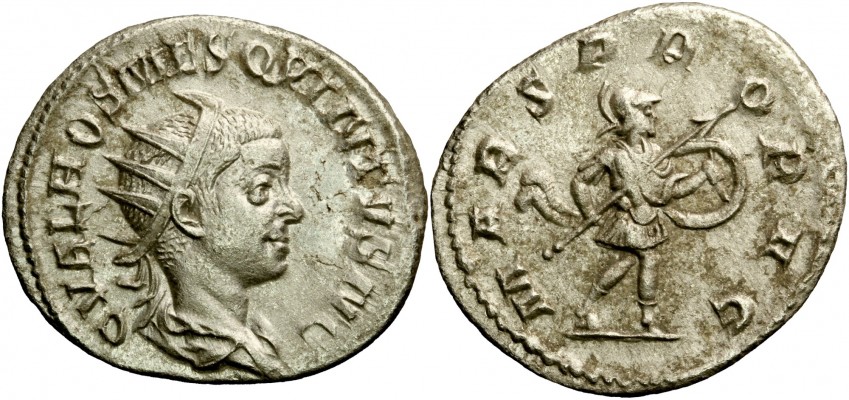 造於公元244至249年,菲力普一世Philip I在位之時的安東尼銀幣AR antoninianus,正面是這位皇帝的肖像和題號IMP M IVL PHILIPPVS AVG,'統帥馬庫斯.朱里烏斯.菲力普烏斯.奧古斯督'之意,後面是VIRTVS AVG'奧古斯督的勇氣',象徵勇氣的擬人像Virtus坐在盔甲之上,手握植物枝條和長矛(或者長權杖?)。